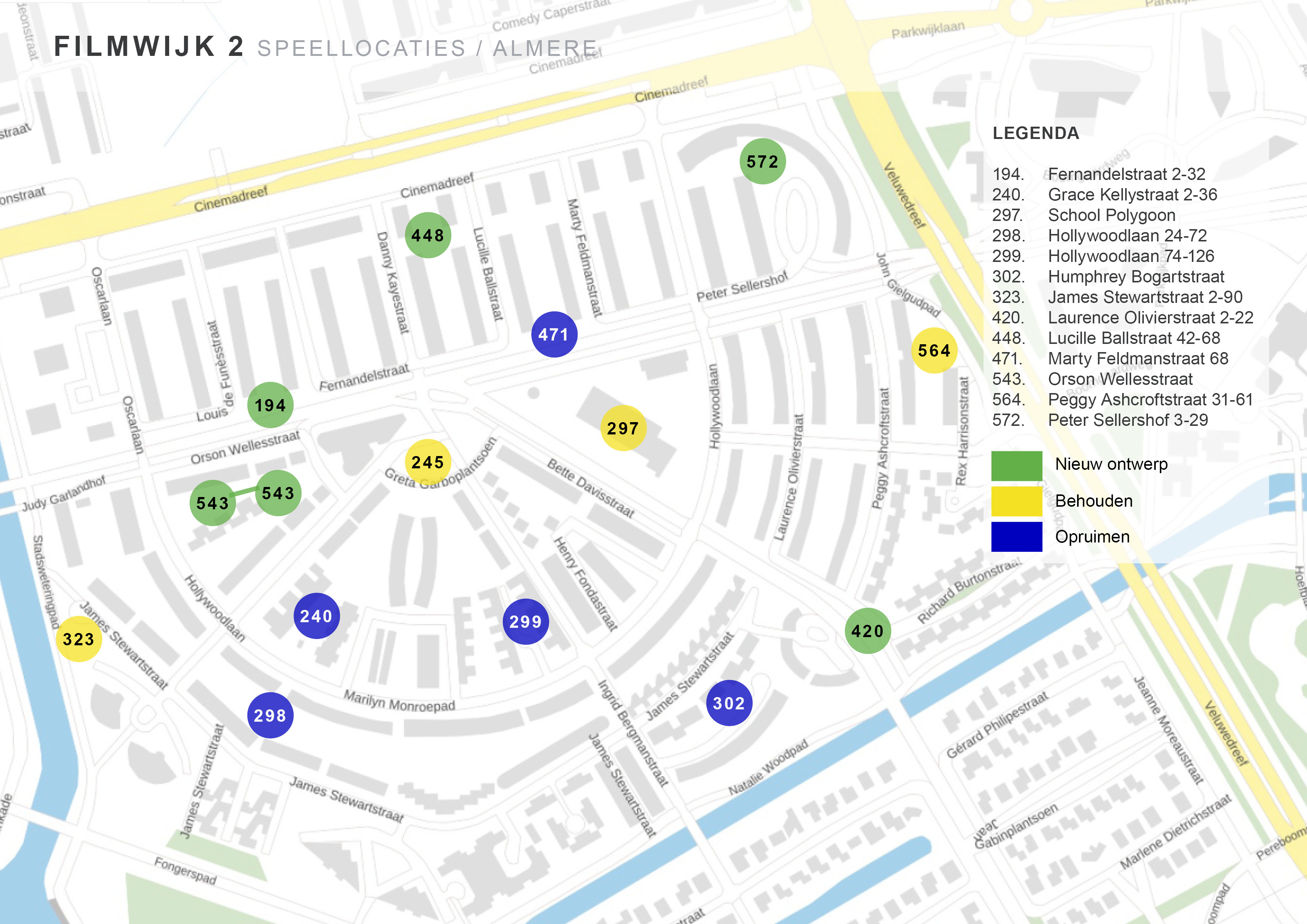 In de Filmwijk gaat het om de speelplekken in het onderstaande kaartje. Een aantal van de speelplekken heeft oude en onveilige speelelementen. In de kaart ziet u de plannen voor de speelplekken. Per fase kunt u reageren op de plannen via de enquete onderaan de pagina.