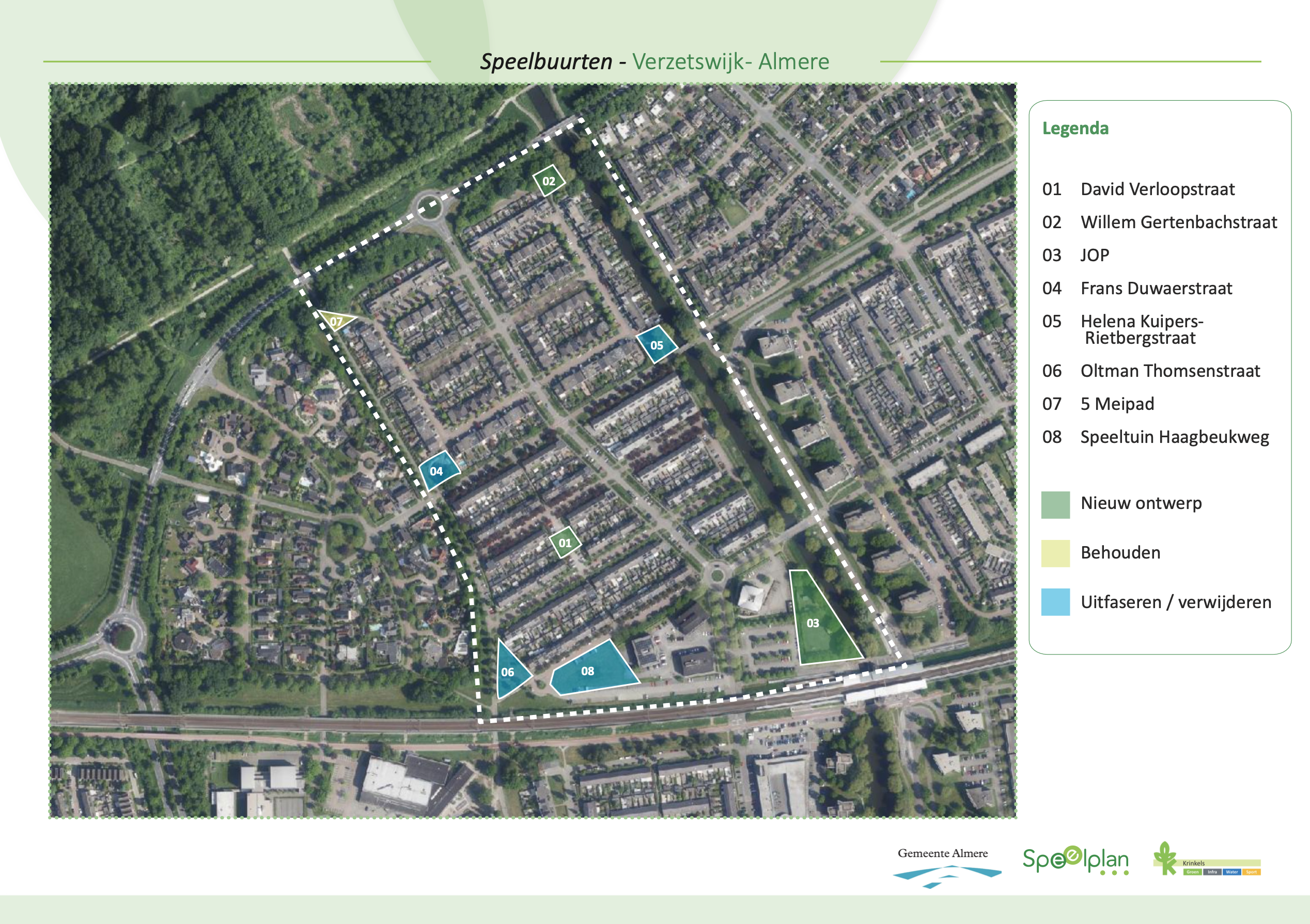 In de Verzetswijk gaat het om de speelplekken in het onderstaande kaartje. Een aantal van de speelplekken heeft oude en onveilige speelelementen. In de kaart zie je de plannen voor de speelplekken. Per fase kan je reageren op de plannen via de enquete onderaan de pagina.
