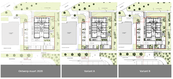 Vanwege het voorstel om het gebouw met 1 bouwlaag te verlagen neemt ook het aantal woningen in het plan af van 35 naar 28. Dat betekent dat het aantal vereiste parkeerplaatsen afneemt van 32 naar 26. Een aantal van die parkeerplaatsen kunnen ingezet worden om extra ruimte te maken voor groen aan de kant van de Schelvisstraat. Voor de terreininrichting zijn daarom 2 varianten getekend. Variant A met 30 parkeerplaatsen en extra groen aan de Schelvisstraat en variant B met 28 parkeerplaatsen en meer extra groen in de vorm van grotere beplantingsvakken bij de doorgang naar de Schelvisstraat. Omdat de parkeerdruk ook een punt van zorg is hebben beide varianten meer parkeren dan vereist. Via de enquête kunt u aangeven welke variant uw voorkeur heeft.
